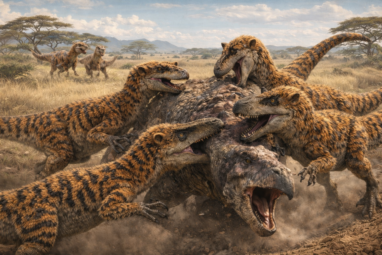 高い学習能力と協調行動を備え、統率された群れによる集団狩猟を行っている知性型恐竜です。現生動物で言えばオオカミにあたります。