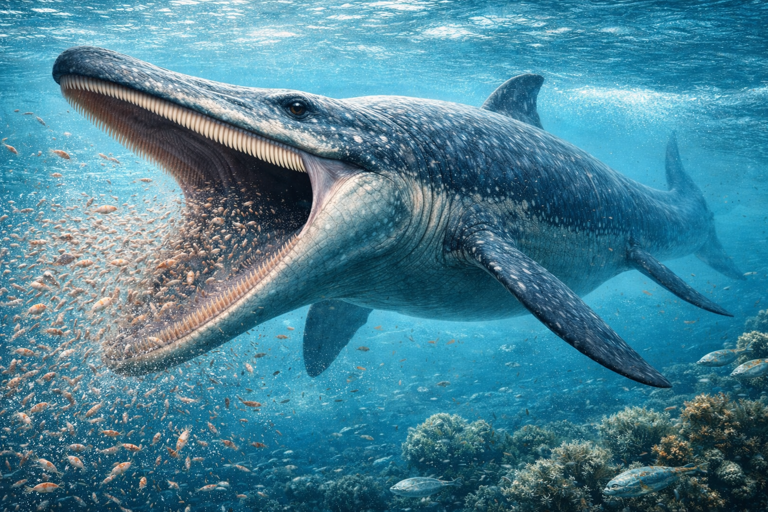 Planktovenator pacificusは、巨大な口腔と発達した濾過器官を備え、プランクトンを主食とする進化型モササウルスです。歯は退化して櫛状構造へ変化し、クジラ類に似た濾過摂食を行います。巨体で海中を回遊し、海洋一次生産を高次栄養段階へ結びつける基幹種として機能しています。