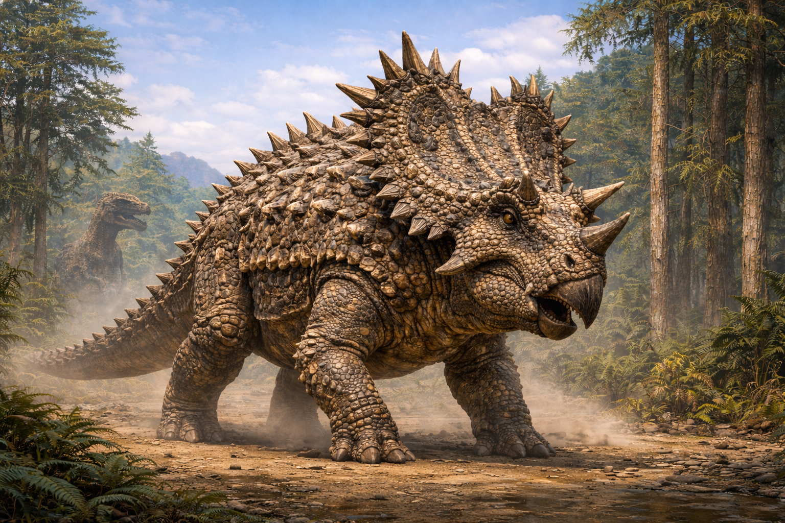 頭部と体表に分厚い骨装甲を発達させ、肉食恐竜との直接衝突にも耐える防御特化型草食恐竜です。