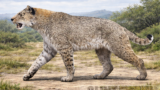 体長2mと大型で、当時反映していた巨大草食哺乳類を狩るのに適していました。現生のネコ科猛獣に比べると後肢が短く、速く走ることはできなかった(必要なかった)と考えられています。