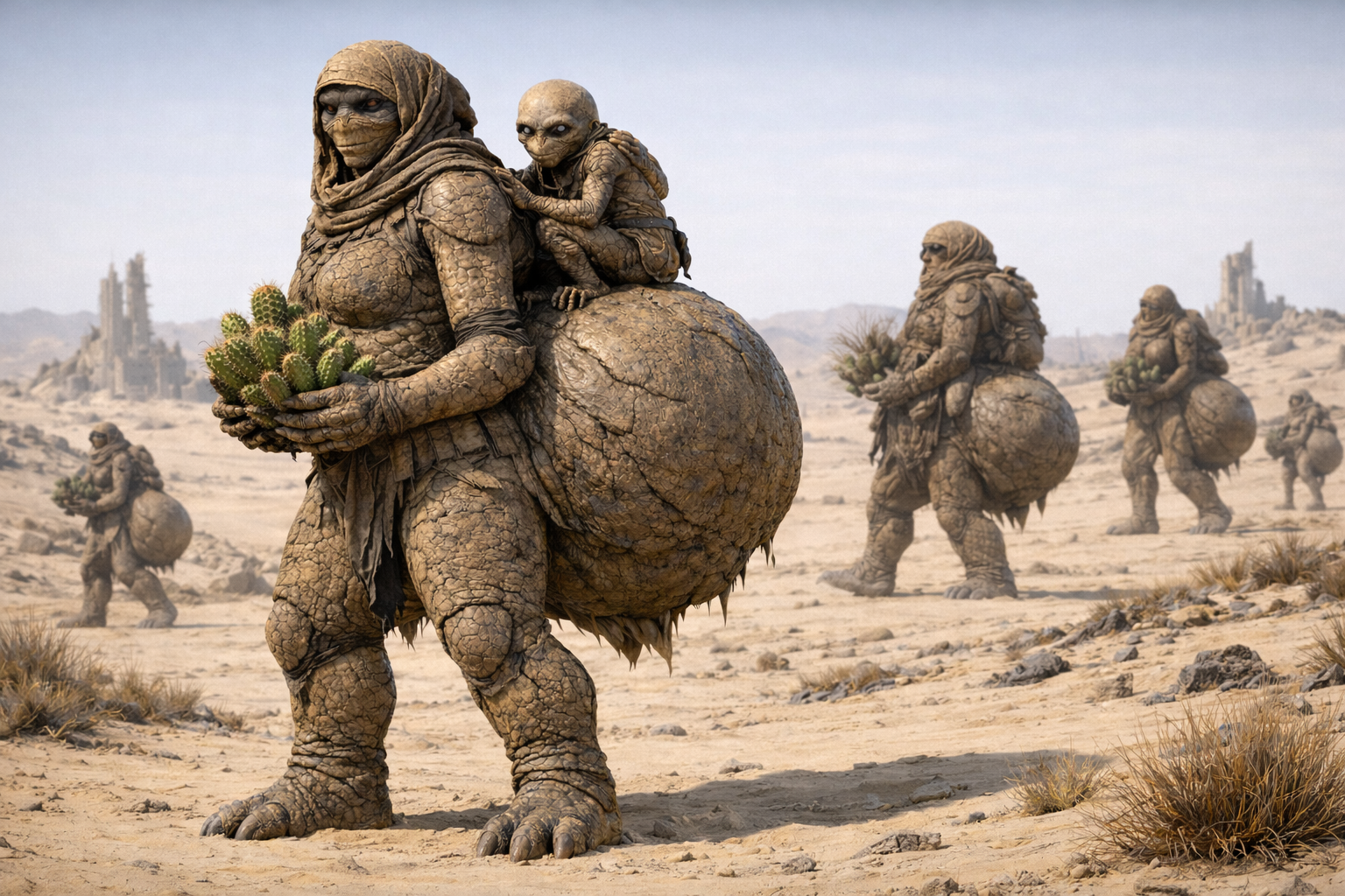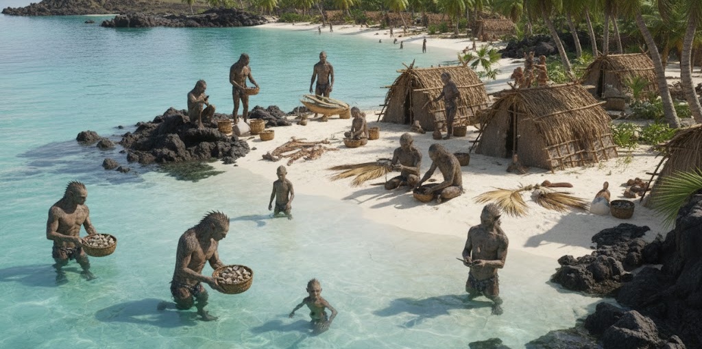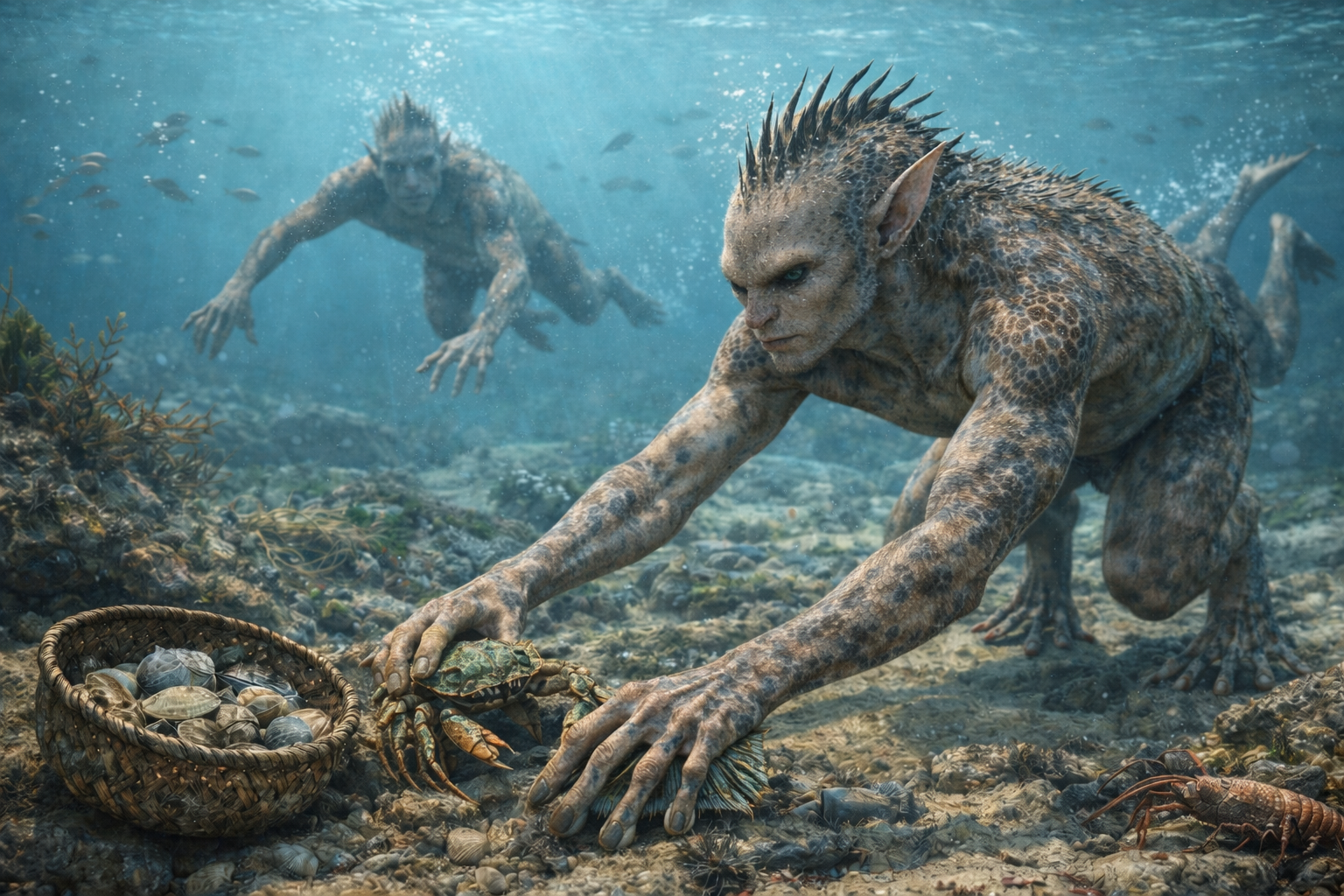 熱帯沿岸の浅瀬に適応したこの系統は、ネクストマンの中でも例外的に高い知性を維持しています。画像からも分かる通り、道具(籠)を用いた採集を行い、複雑な社会構造を保っています。身体面では、水中での屈折率に対応した高い水中視力と、推進力を生む指間の水かきを獲得。最大の特徴は、体表を覆う鱗状の角質層で、これが寄生虫や岩礁による外傷から身を守る装甲として機能しています。