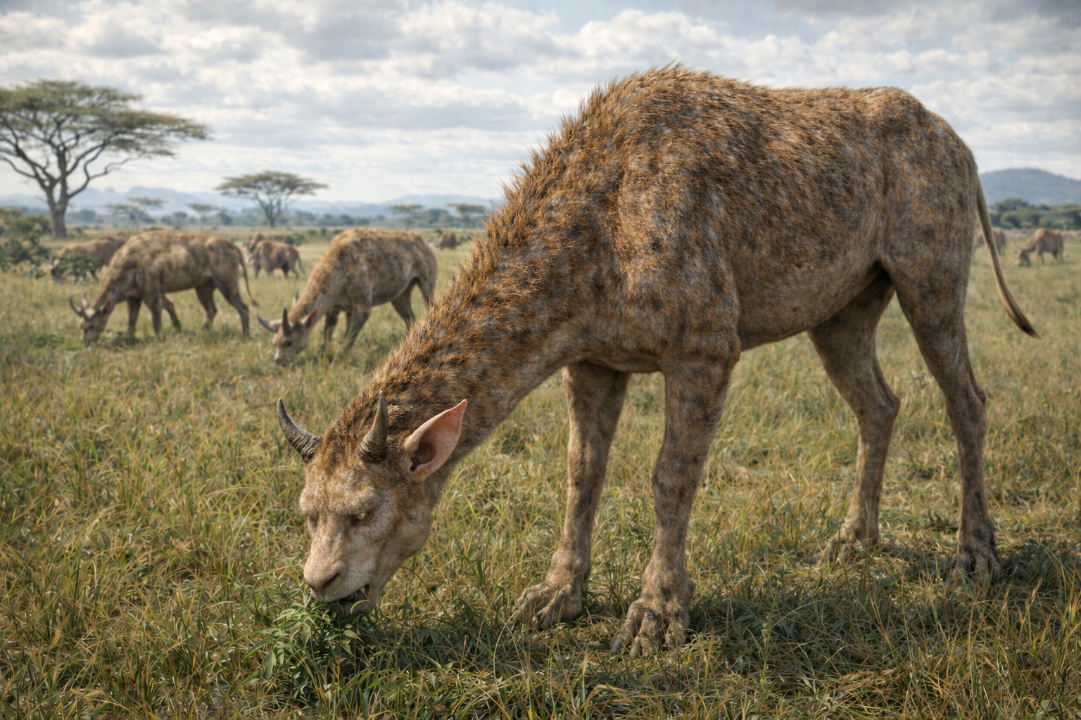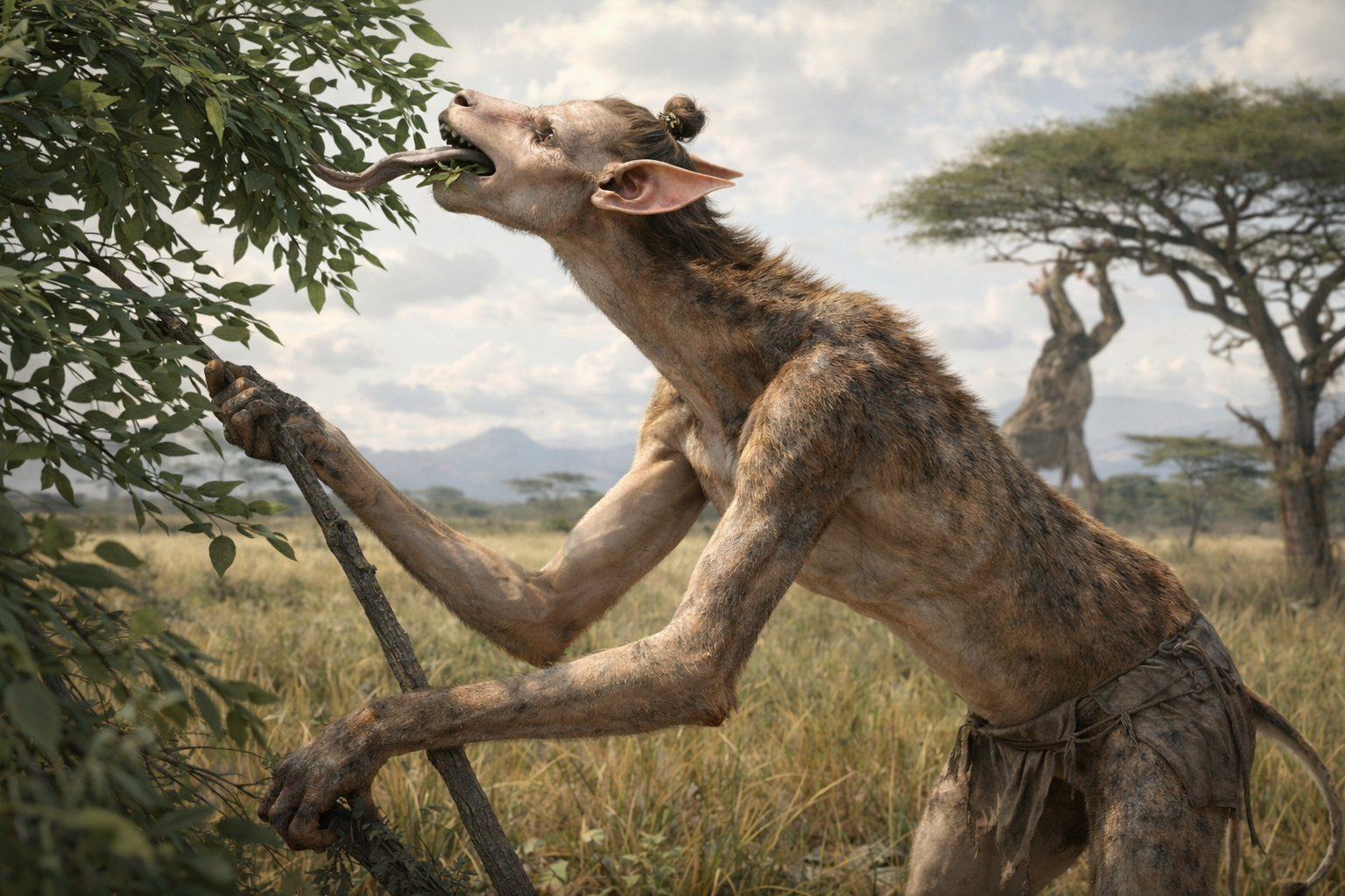 サバンナへの進出に伴い、直立歩行を捨て四肢走行へ移行した系統。消化効率を高めるため大腸が肥大化し、腹部が膨らんでいます。爪は平坦化し始め、蹄への進化の途上にありますが、手先にはまだ樹上生活の名残である把握能力が保持されています。