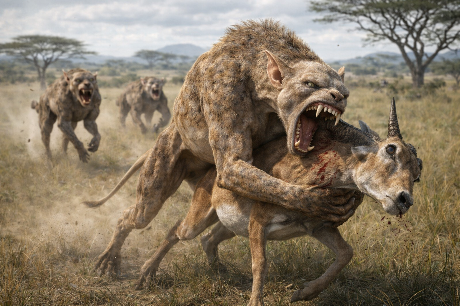 この「全身の重武装化」とのトレードオフとして、代謝コストは極限まで高まり、消化効率を優先するため脳容積は縮小。個としての情緒や複雑な思考は削ぎ落とされました。しかし、生存に直結する集団協調狩猟の知能だけは研ぎ澄まされており、連携して獲物を追い詰めるその姿は、100万年後の草原における戦慄すべき頂点捕食者そのものです。