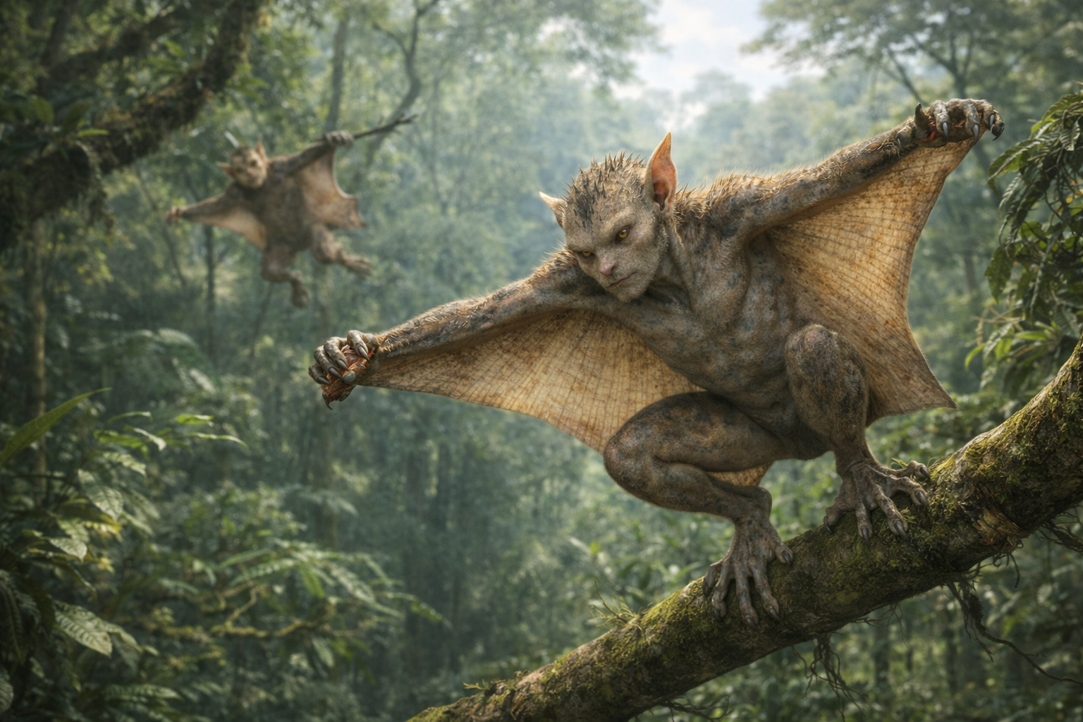 グライドマンは、熱帯雨林の樹冠層(キャノピー)という未利用のニッチに適応した、人類の小型化進化系統です。画像に見られる通り、最大の特徴は脇から肢体にかけて形成された滑空用の飛膜(パタギウム)で、これにより樹木間を効率的に移動し、地表の捕食者から完全に逃れました。樹上生活への特化に伴い、四肢は把握力の強い長い指と鋭い鉤爪へと変貌し、体重を軽減するために骨格は鳥類のように中空化・軽量化されています。