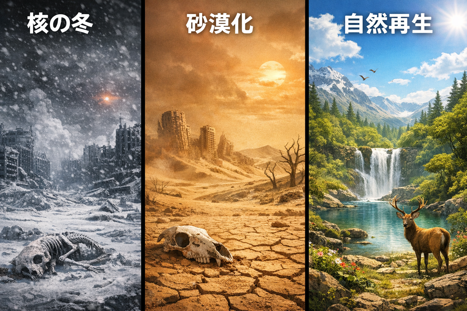 「大量絶滅」という地質学的な巨大イベントは、旧勢力の退場と同時に、驚異的な「適応放散」の引き金となります。AIが放った核の火と、その後に訪れた「核の冬」から1000万年。