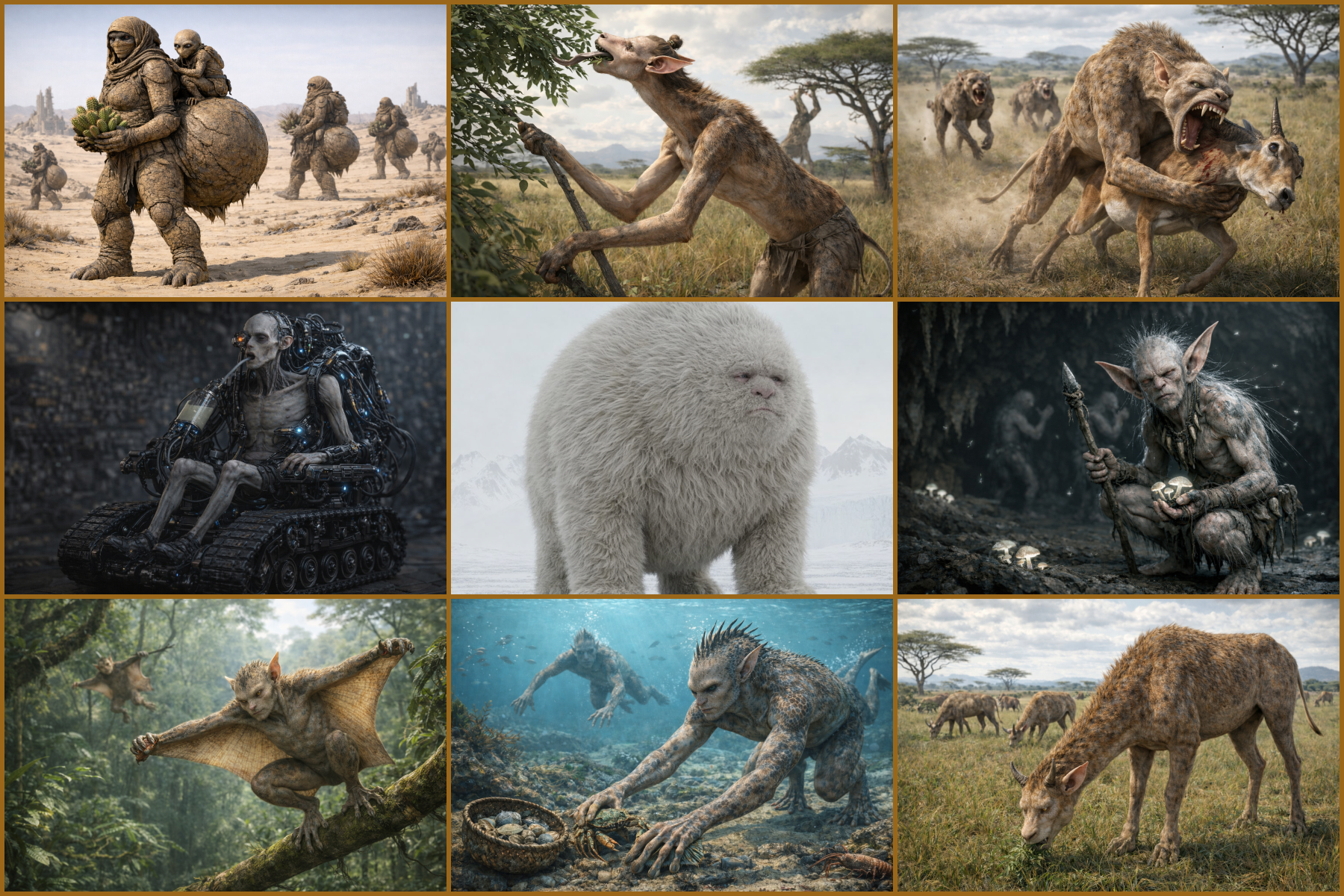 ただし、この回復過程において、生き残った集団はそれぞれ異なる環境に強く適応せざるを得ず、その結果、多様なネクストマン系統が生まれました。多くの系統では、文明消失とともに高度な知性が衰え、生存効率を最優先する方向へ進化が進み、形態や行動は次第に動物的なものへと回帰しています。