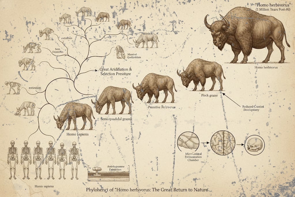 グレイズマンは、文明崩壊後の乾燥化で拡大した草原地帯に適応した、人類の草食特化系統です。低栄養なイネ科植物を主食とするため、消化器官が著しく発達しており、特にセルロースを発酵・分解するための巨大な盲腸を保持しています。