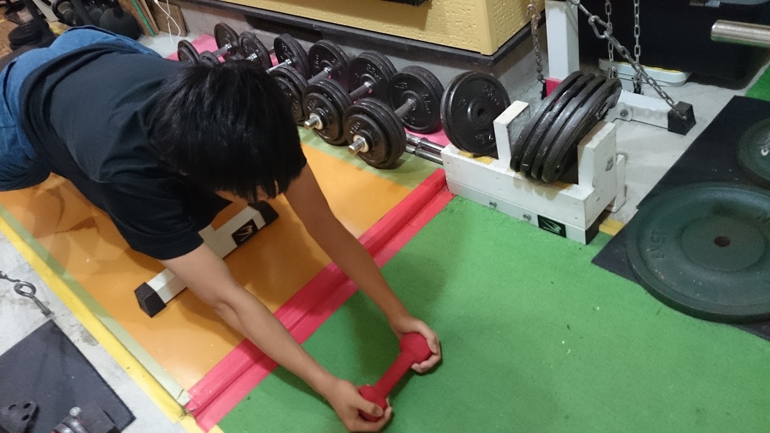 高校1年生でバックエクステンショントレーニングを始めたころは、トップ画像のように無負荷(自重のみ)でしたが、高校2年生の頃にはトップの写真のように2~3kgのウエイトを追加しました。