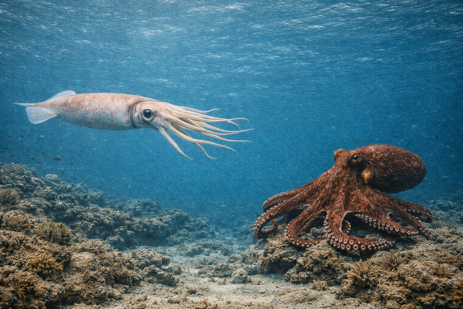 一方、タコは基本的に泳ぎを主としません。腕を使って海底を歩くように移動するのが中心です。短距離なら泳ぐこともありますが、持続的な高速移動には向いていません。
