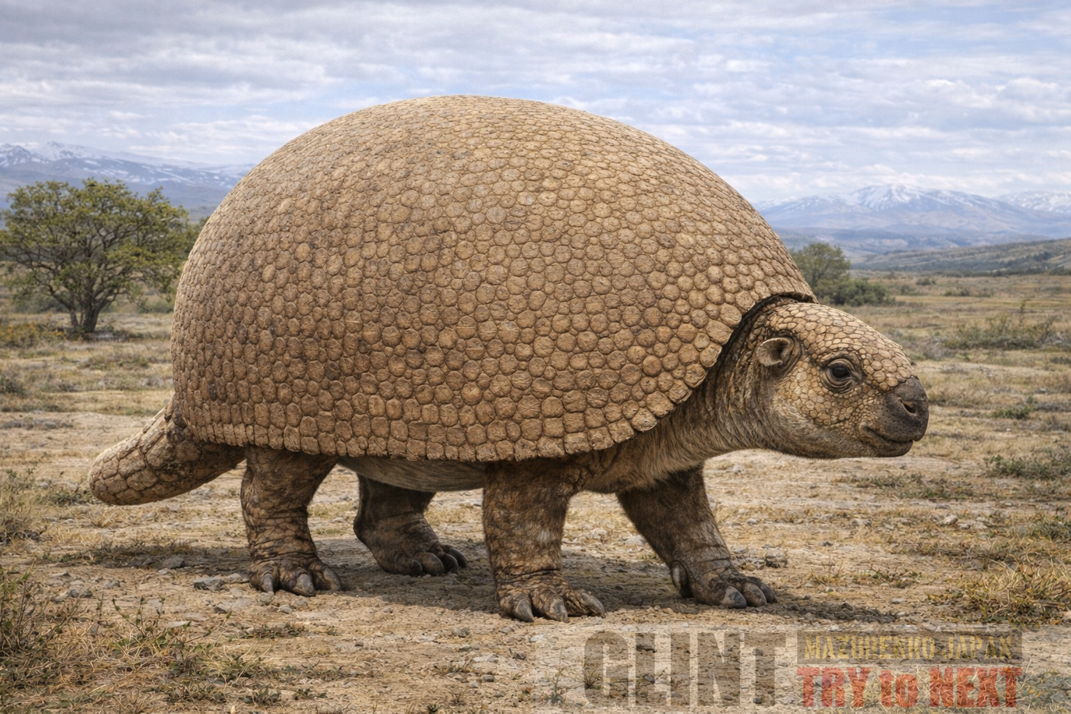 更新世の異節類。ドーム状の骨質甲羅で体を覆い、遅い代わりに高い防御で生きる装盾草食型へ収斂しました。