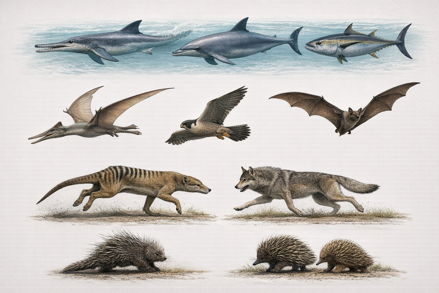 紡錘形の体、外部突起の縮小、四肢のひれ化、尾部推進の発達が収斂し、高速巡航と長距離移動に有利になります。
