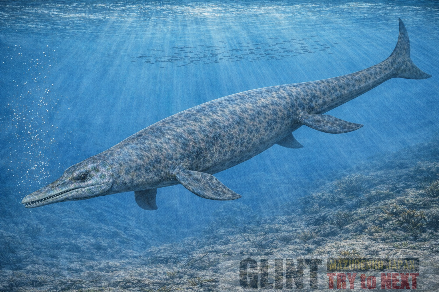 全長は約6〜9mに達すると推定される大型海生爬虫類で、細長い胴体と長い尾を備えていました。尾鰭はまだ完全な三日月型ではなく、背ビレも未発達でしたが、推進力は高く、外洋性遊泳にも適応し始めていました。頭部は比較的小型で、鋭い歯を備えていました。