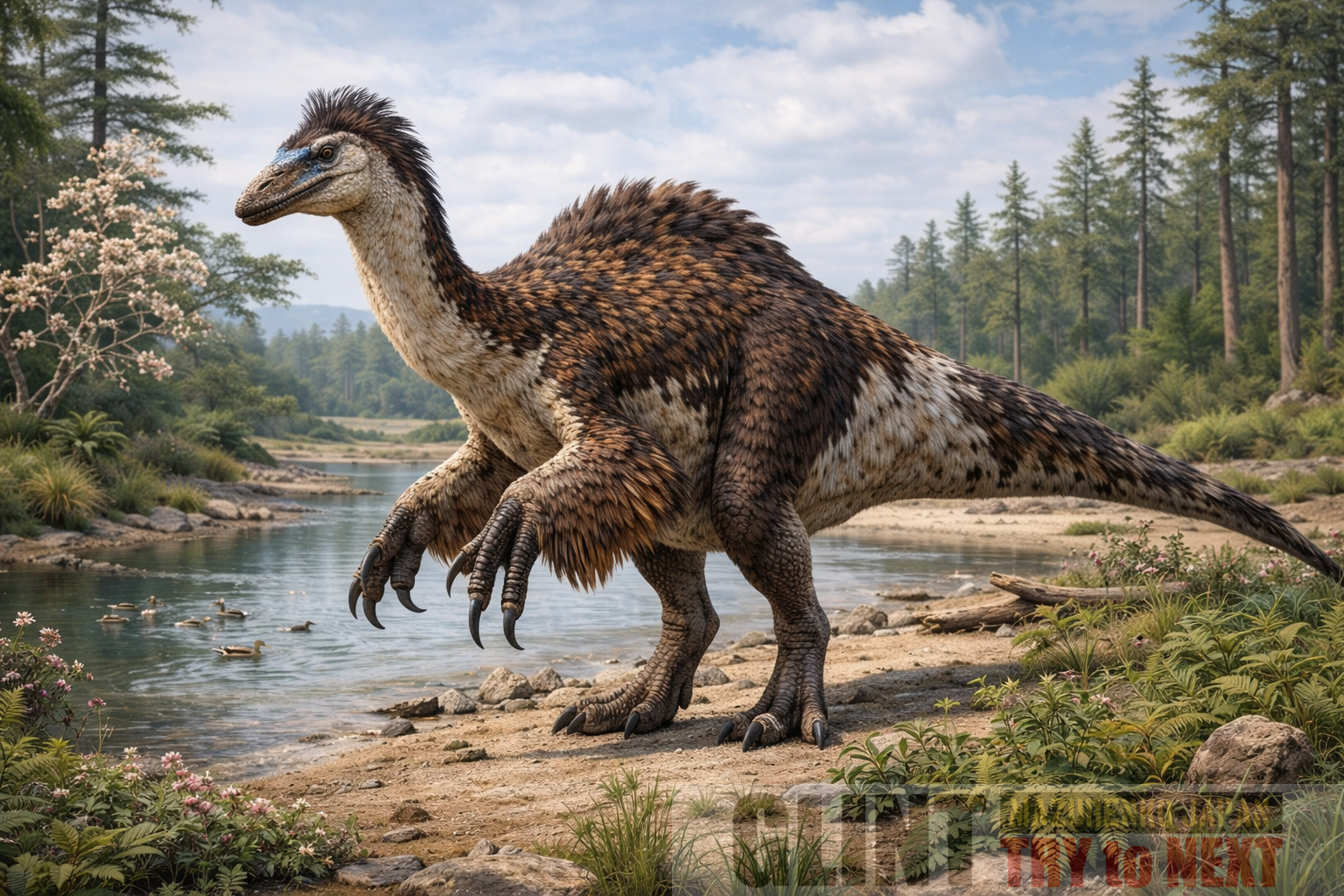 植物や小動物、水生生物などを幅広く摂取する雑食性恐竜で、河川や湿地周辺を主な生活圏としていたと考えられています。巨大な前肢は採食や防御に用いられ、生態系において特異な地位を占めていました。