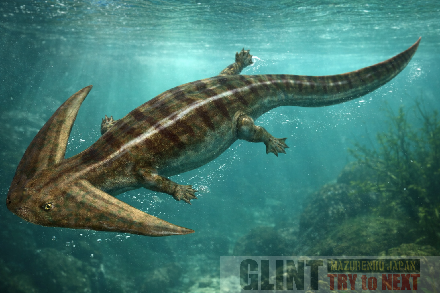 ディプロカウルスはレポスポンディル類ネクトリド目に属する水生四肢動物で、特徴的な頭骨形態を持つ派生的な系統です。現生両生類とは直接の系統関係を持たない側系統ですが、石炭紀からペルム紀にかけての淡水生態系における重要な構成要素でした。