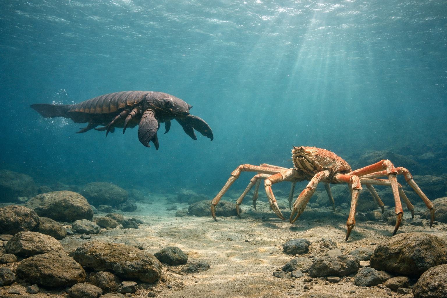 古生代に生息した巨大ウミサソリ類で、節足動物史上最大級の体サイズです。大型化した前脚と遊泳適応により、当時の水域上位に位置しました。