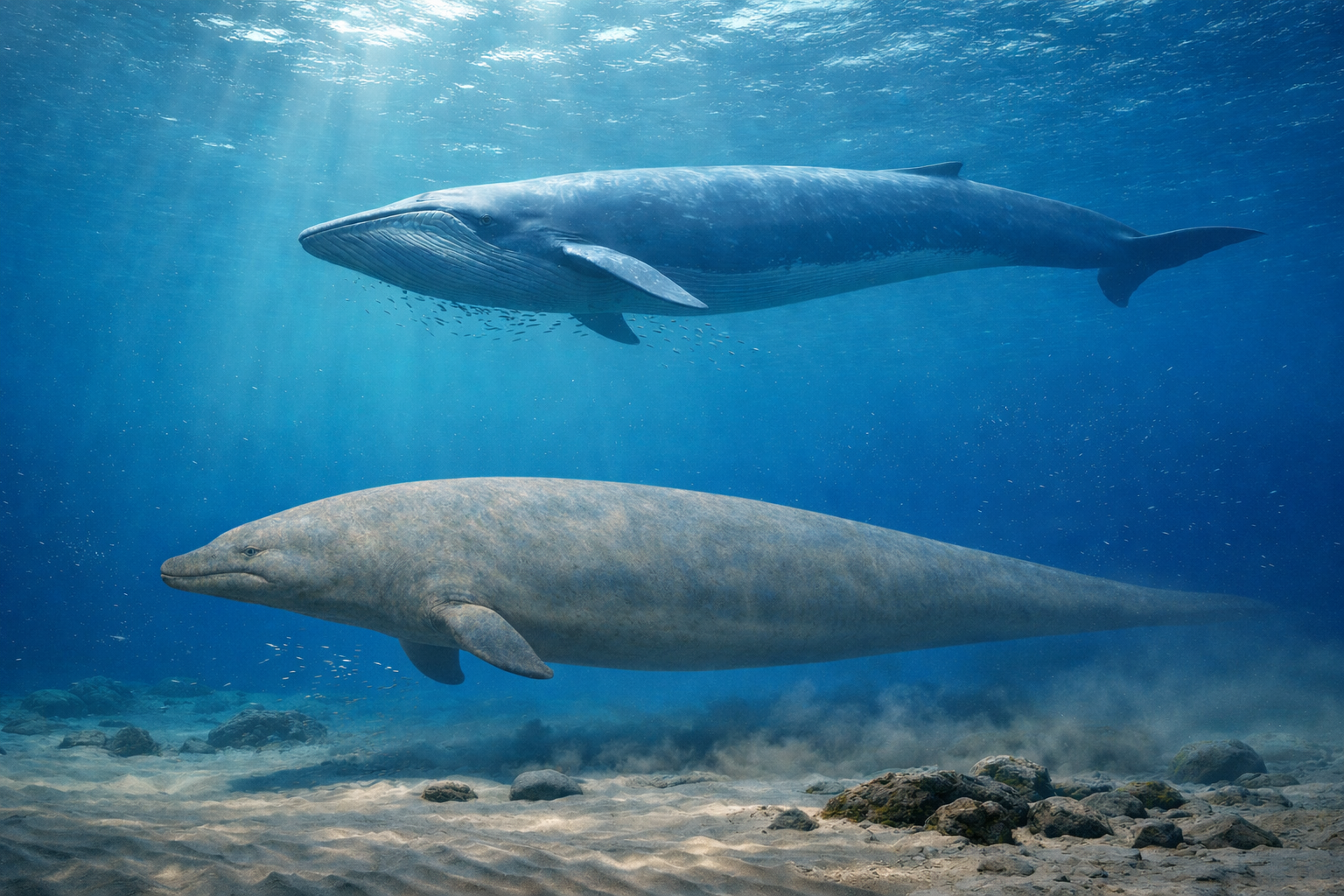 地球史上最大の生物です。濾過摂食で膨大なプランクトン資源を取り込み、海という環境の浮力が、極端な巨大化を現実にしています。