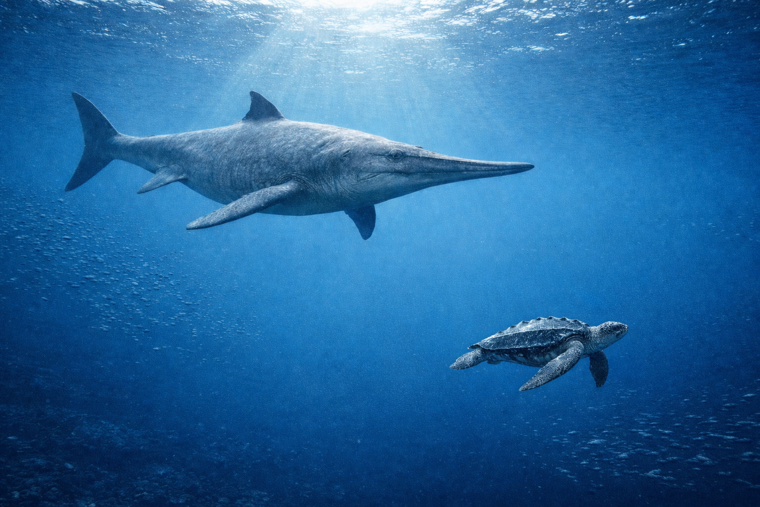 三畳紀の巨大魚竜で、海の巨体戦略の到達点です。巨大化は長距離遊泳と資源探索に有利で、海洋という舞台が上限サイズを押し広げます。