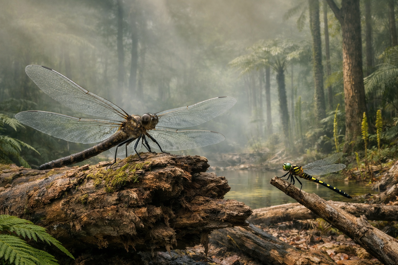 史上最大の飛翔昆虫として知られる巨大トンボ類です。昆虫の気管呼吸でも飛翔可能なサイズに到達できたのは、古生代の高酸素環境が前提でした。