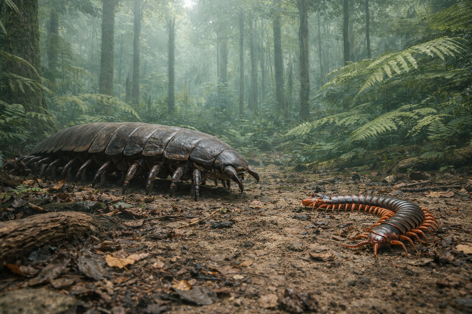 現生最大級のムカデで、強い捕食性と毒性を持ちます。現代の酸素濃度と生態系競争下では、この規模が陸生節足動物の現実的上限に近づきます。
