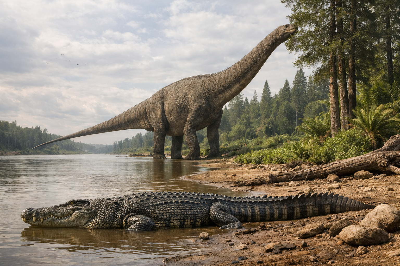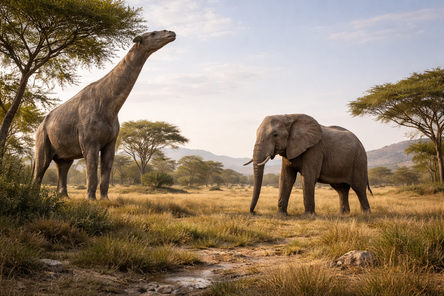 史上最大級の陸上動物で、竜脚類の巨大化の極限です。植物資源の大量摂取と骨格の軽量化が両立し、陸上でのサイズ上限を押し上げました。
