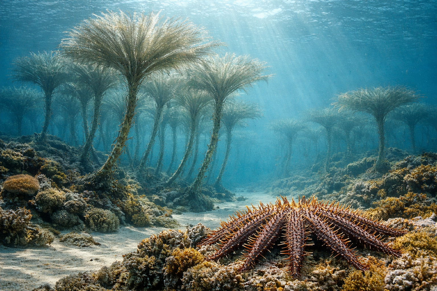 現生最大級のヒトデで、サンゴを捕食することで知られます。棘皮動物は体制上の制約が強く、極端な巨大化よりも数と捕食圧で存在感を示します。