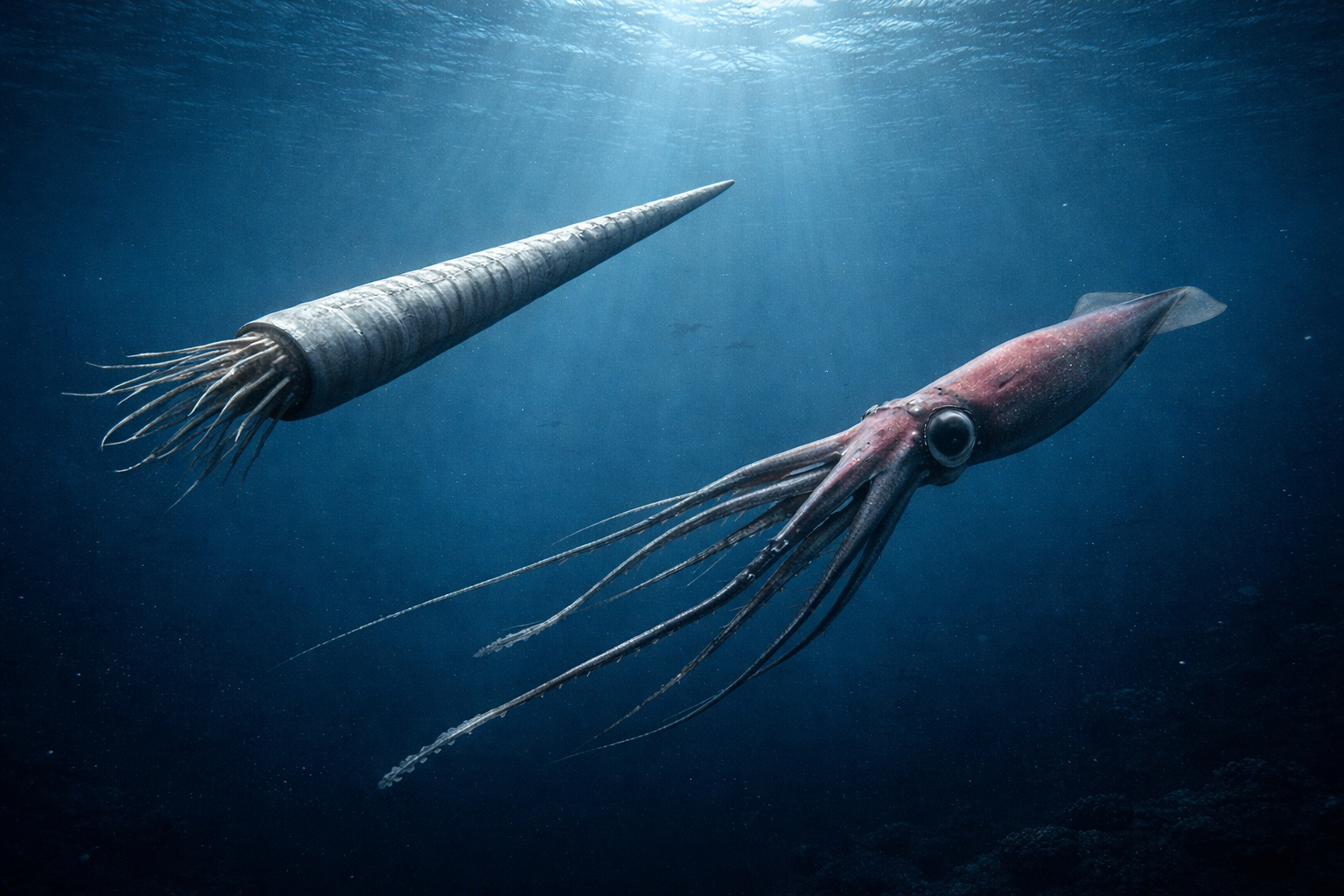 オルドビス紀の巨大直角石類で、初期頭足類の巨大化の象徴です。直線殻は浮力調整と移動の両立が難しく、巨大化が生態戦略そのものになります。