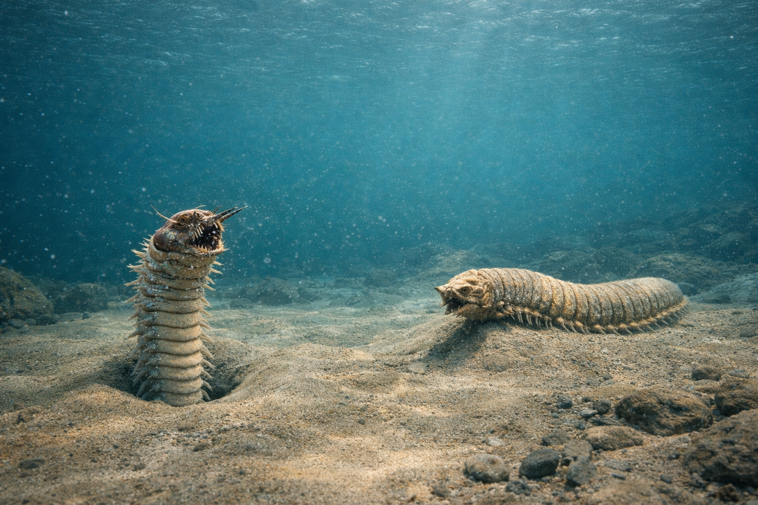 海底に潜み、強力な顎で獲物を捕らえる待ち伏せ型捕食者です。環形動物の中でも最大級で、細長い体制が大型化に有利です。