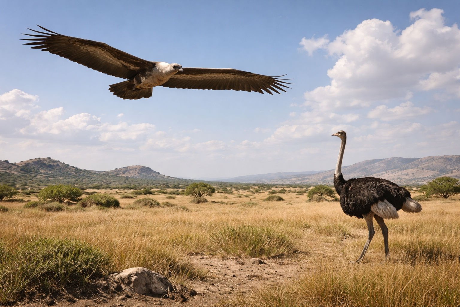 現生最大の鳥で、走行に特化して飛翔を捨てた系統です。鳥類の巨大化は飛翔と両立しにくく、地上生活への特化が最大化を許します。
