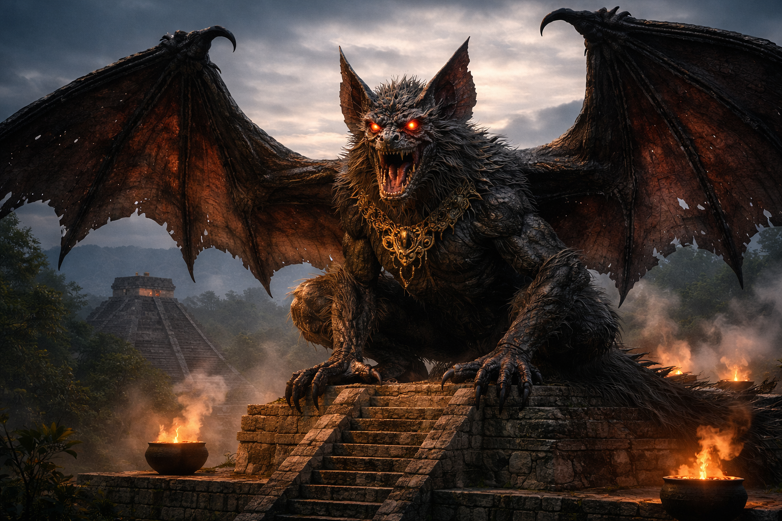 巨大なコウモリの姿を持つ冥界の怪物で、生贄儀礼や夜の恐怖と結びつきます。洞窟に棲むコウモリの生態が神話化されました。