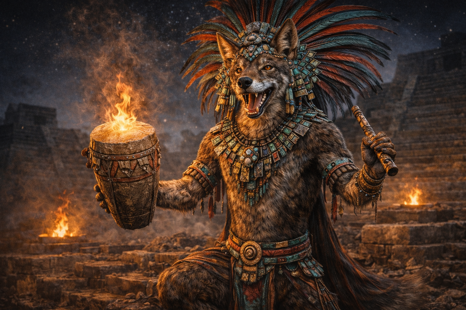 コヨーテの姿を持つトリックスターで、秩序を乱しながら知恵をもたらす存在です。乾燥地帯に適応した動物のしたたかさが反映されています。