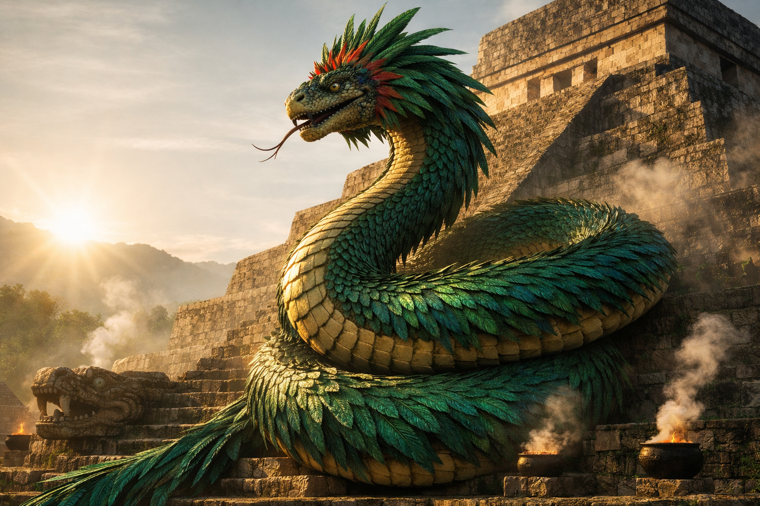 羽毛を持つ蛇として知られ、天空と地上を結ぶ存在です。蛇は大地と地下世界、鳥は天空を象徴し、農耕と暦の知識をもたらす文化英雄としての性格を持ちます。熱帯林に生息する鮮やかな鳥類と大型の蛇が結びついた造形です。