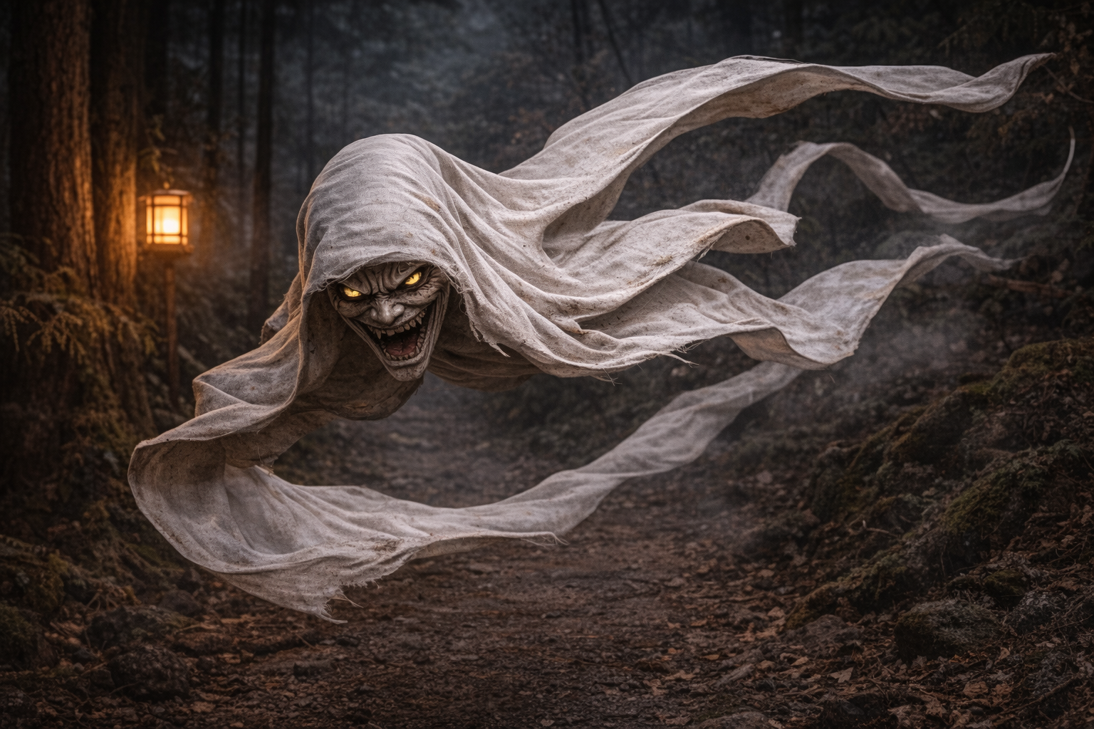 夜間に舞う布片や霧の錯覚が起源と考えられます。
