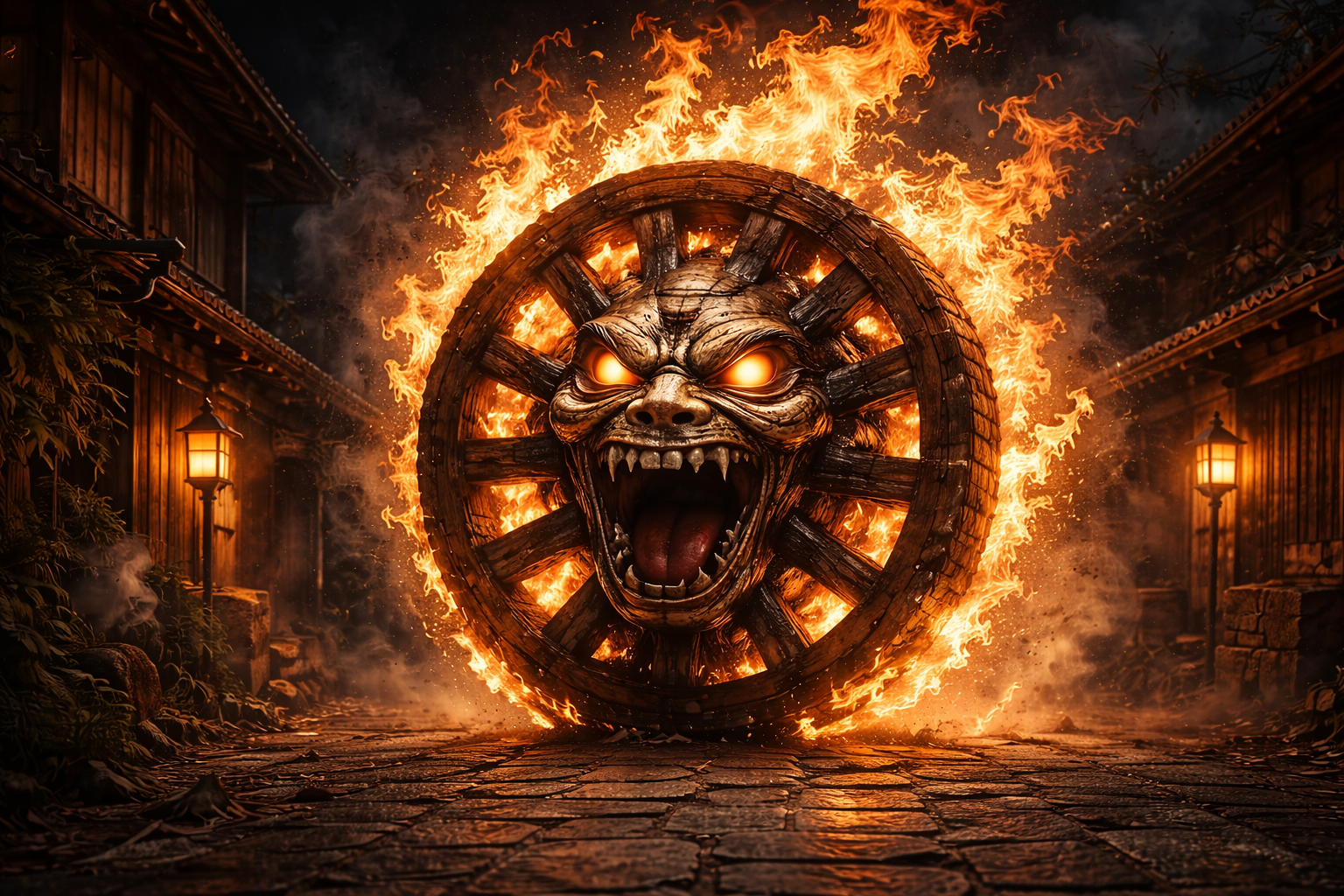 炎に包まれた車輪に顔が浮かぶ異形です。