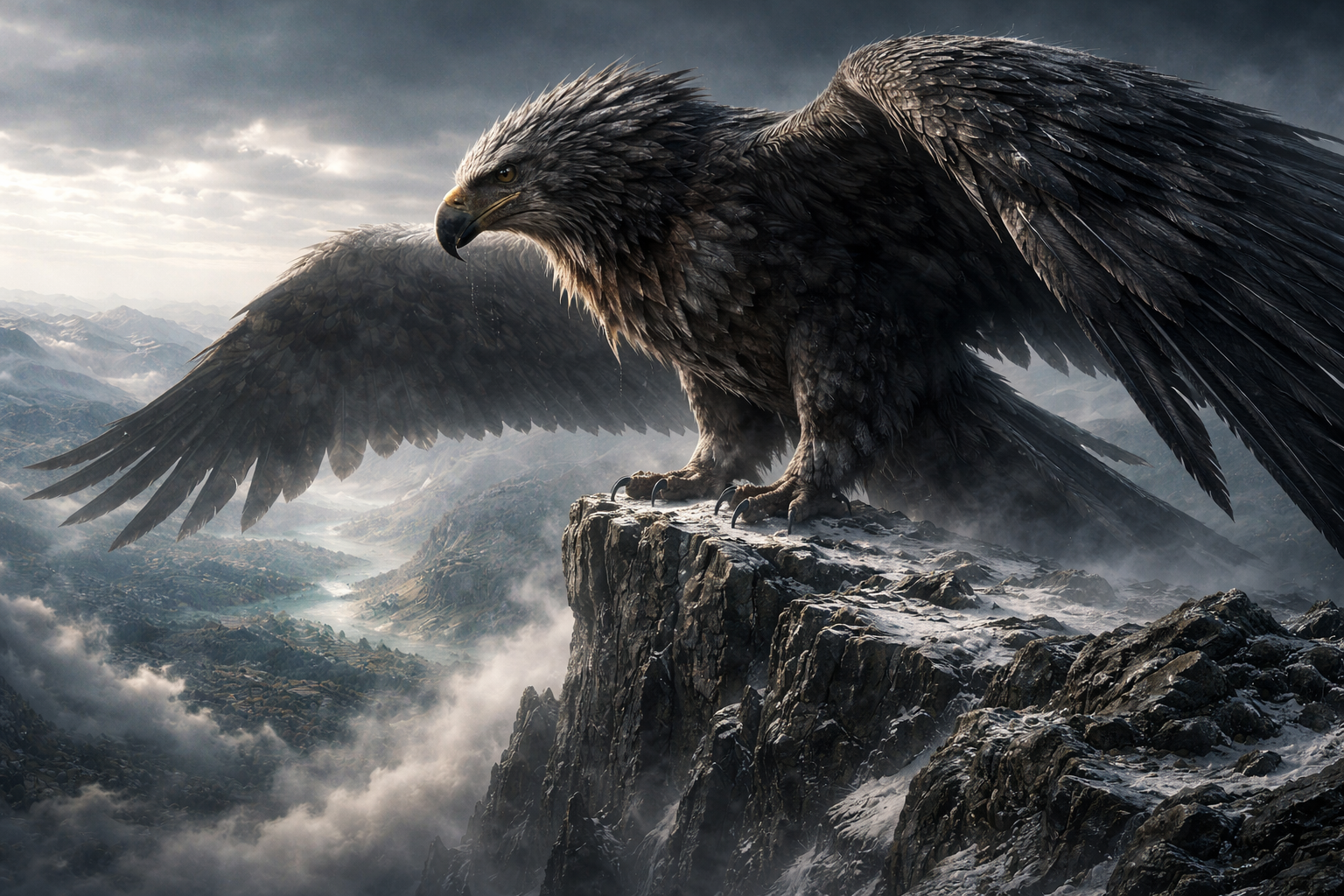 シロオジロワシ(Haliaeetus albicilla)|北欧沿岸に生息する大型の海ワシで、巨大な翼で滑空し強風下でも飛行します。風を生む鷲という観念は、海と断崖の気流で舞う姿への畏怖が神話化したものと考えられます。