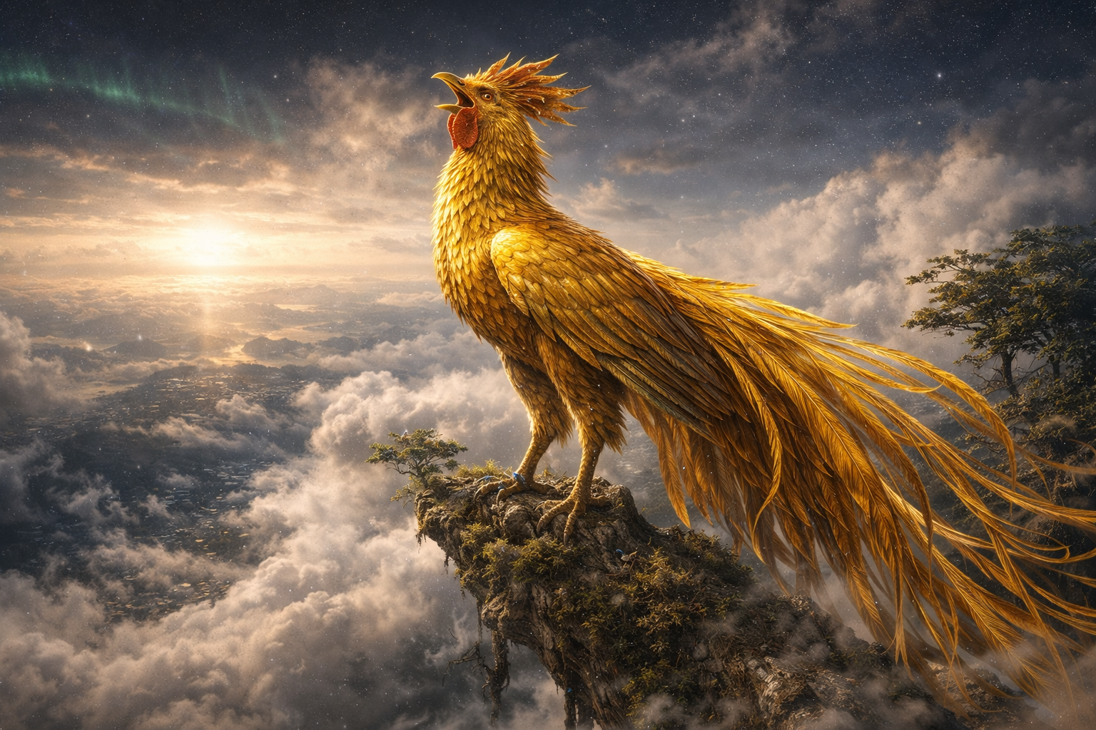 世界樹ユグドラシルの頂にとまる黄金の鶏であり、天界の覚醒と時間の始動を象徴する存在です。夜明けを告げる鳥というモチーフは北欧の生活環境における光の回帰と結びついています。高所に生息する鳥類への観察が神話化したもので、天空層における生態的指標種として世界の構造を示す役割を持ちます。