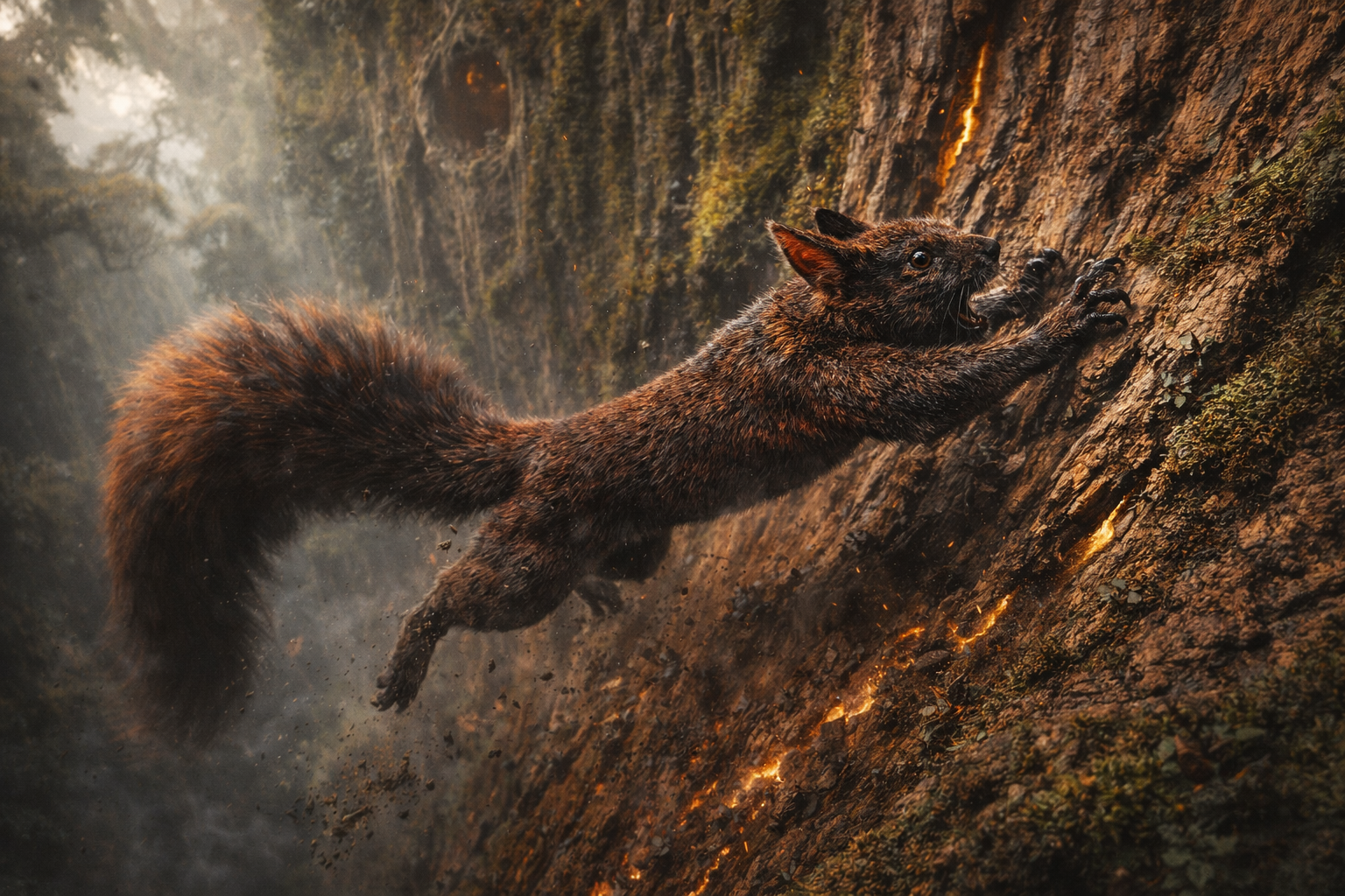 キタリス(Sciurus vulgaris)|ユーラシア北部の針葉樹林に生息する樹上性齧歯類で、幹を高速で上下移動し、枝から枝へ跳躍して広い行動圏を持ちます。警戒音による情報伝達や貯食行動は森林内の伝達者としての印象を生み、世界樹を往復するラタトスクの原像になったと考えられます。