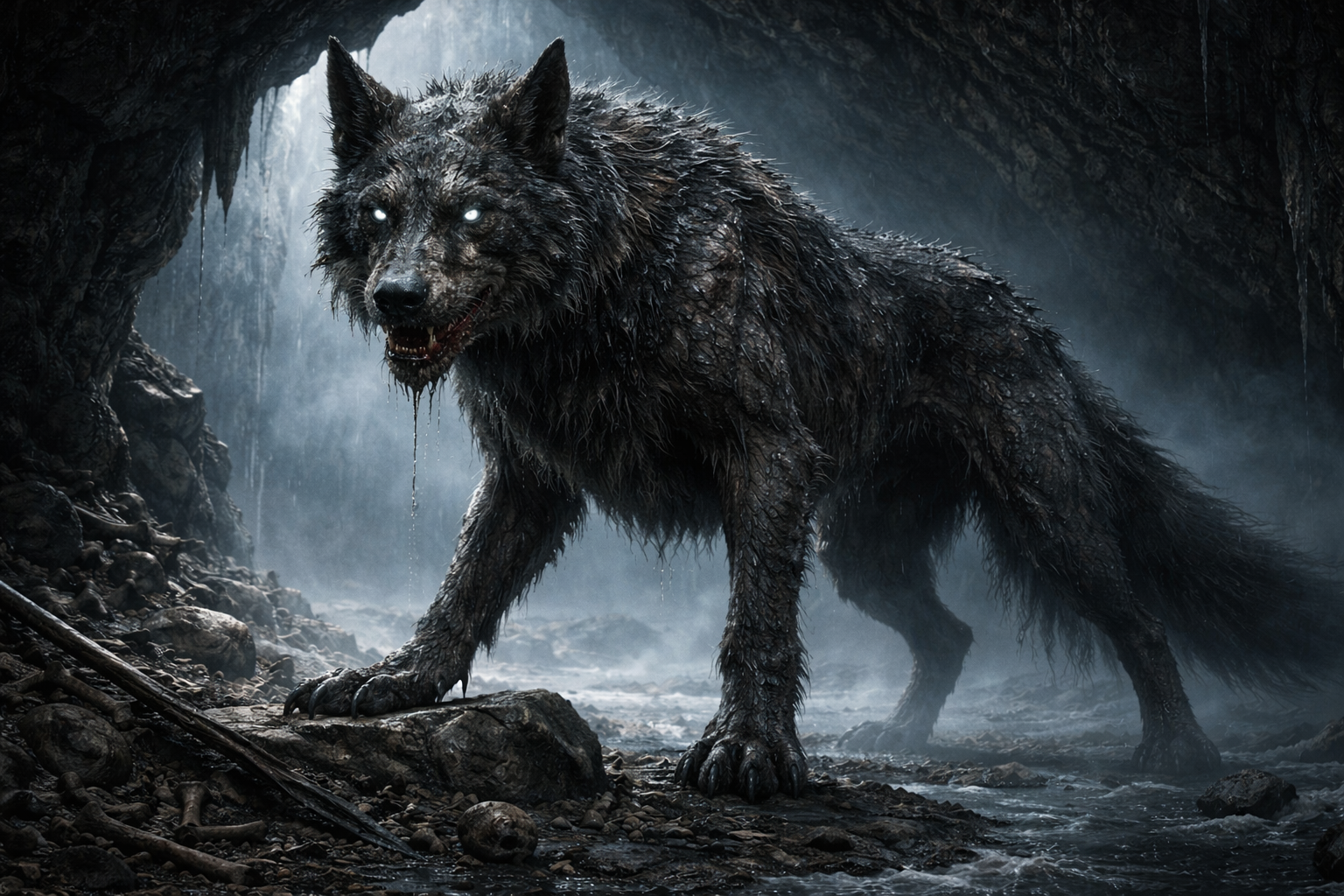 拘束されることでしか秩序を保てない巨大な狼です。群れで狩りを行うオオカミは社会的動物でありながら人間にとっては脅威でした。その両義性が神話的に拡張されています。制御不能な捕食者は社会秩序の外側にある力を象徴します。