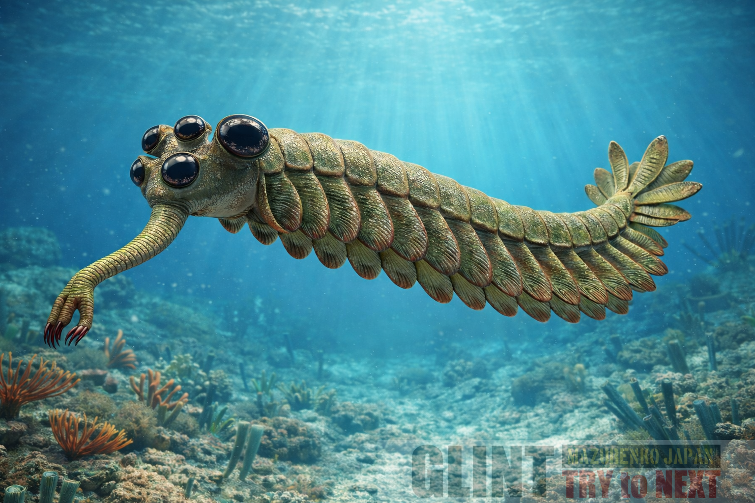 古生代(カンブリア紀)の海には、現在では考えられないような姿をした巨大な節足動物(恐蟹類とも呼ばれる)が大繁栄していました。