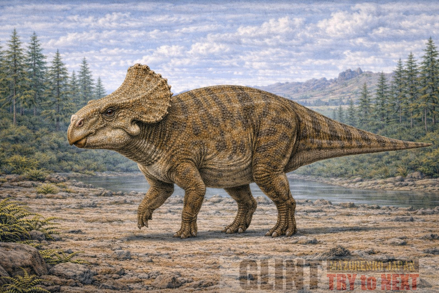 全長は約1.8〜2.5m前後と推定される小型恐竜で、大きく発達したフリルと鋭い嘴を備えていました。角は発達しておらず、頬骨周辺の骨質構造が比較的発達している点が特徴です。体型は低重心で安定していました。