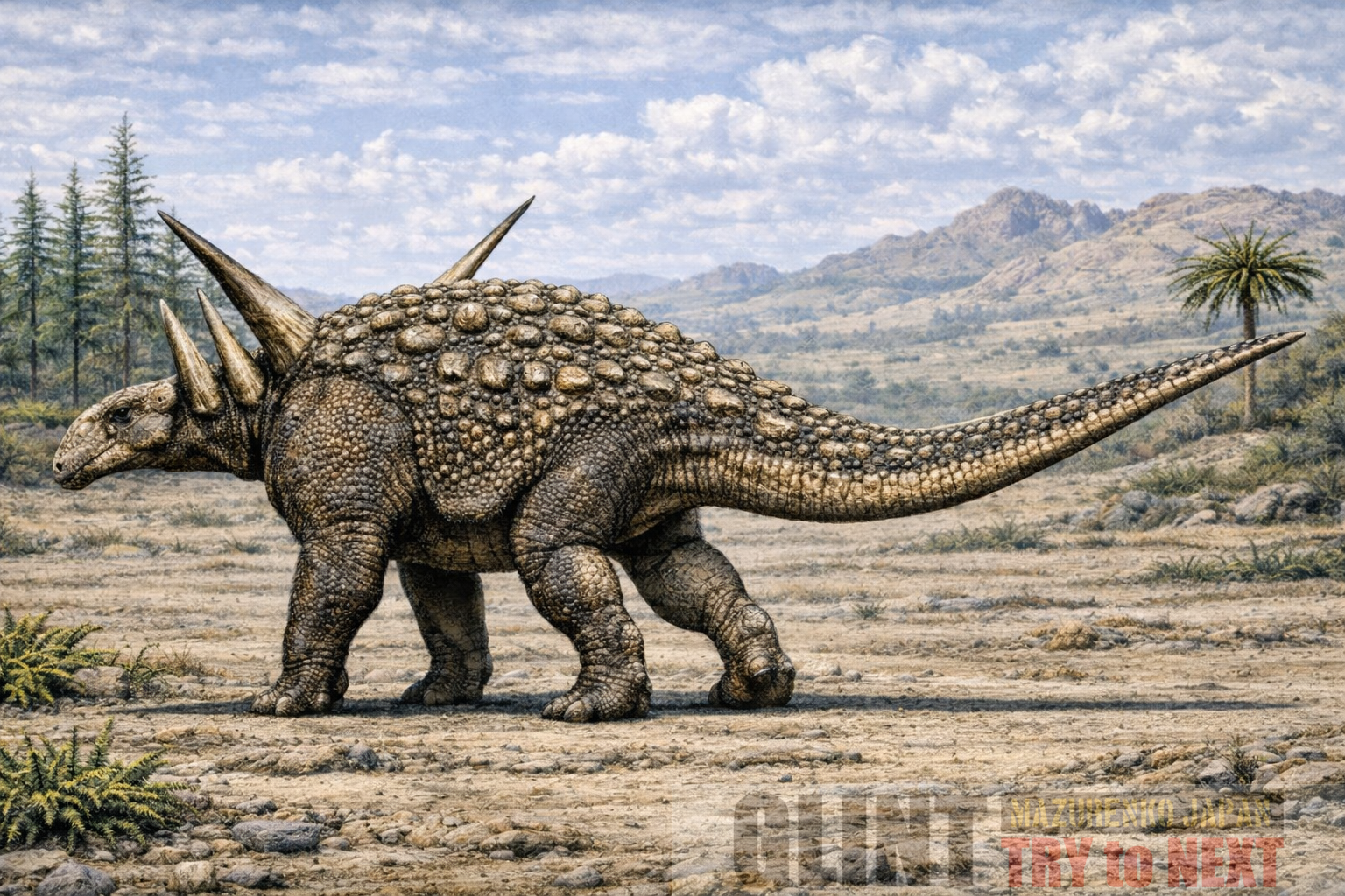 全長は約5〜6mに達すると推定される中型装甲恐竜で、背中や側面、頸部に厚い骨板と鋭い棘が密集していました。特に頸部には大型の側方棘が発達しており、防御性能を大きく高めていました。体高は低く、重心の低い安定した体型をしています。