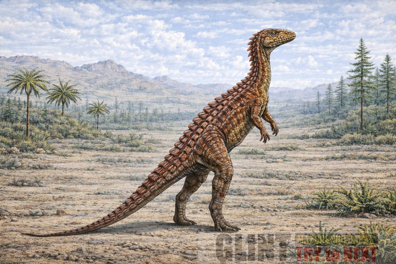 全長は約1.2〜1.5m前後と推定される小型恐竜で、軽量な体格をしていました。体表には数百枚以上の小型骨板が散在しており、防御機能を担っていました。後肢が比較的発達しており、二足歩行と四足歩行を併用していたと考えられています。