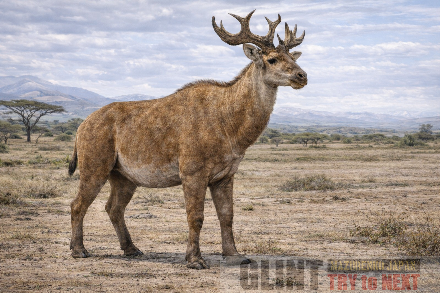 主に低木や高木の葉を採食する草食性哺乳類で、比較的低〜中層植生を利用していたと考えられています。発達した角は繁殖期の闘争や威嚇行動に用いられ、開けた環境での視覚的誇示にも重要な役割を果たしていました。