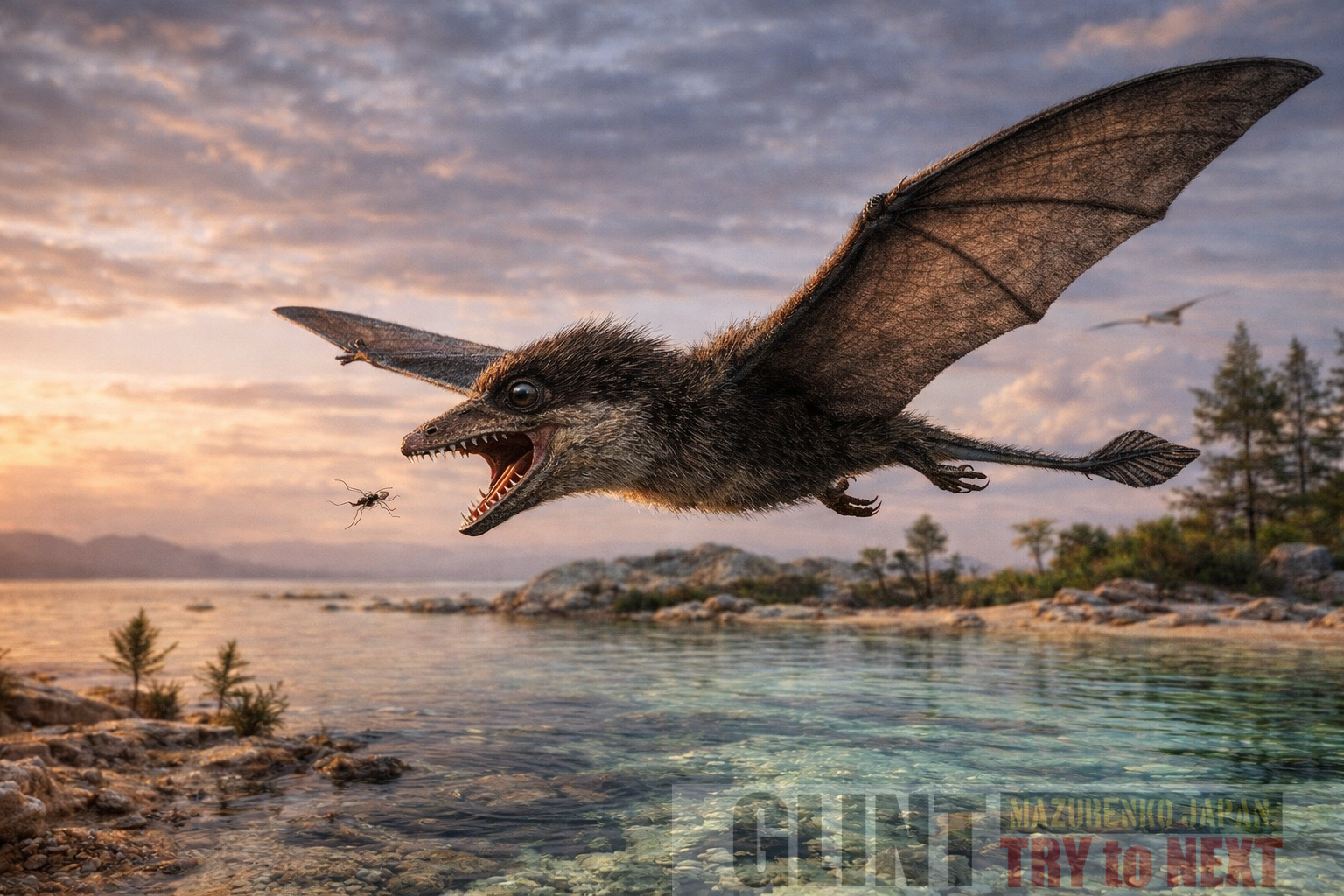 細長い歯を備え、小型魚類や昆虫を捕食していたと考えられます。発達した尾帆は飛行時の姿勢安定に関与し、機動性の高い低空飛翔を行っていた可能性があります。