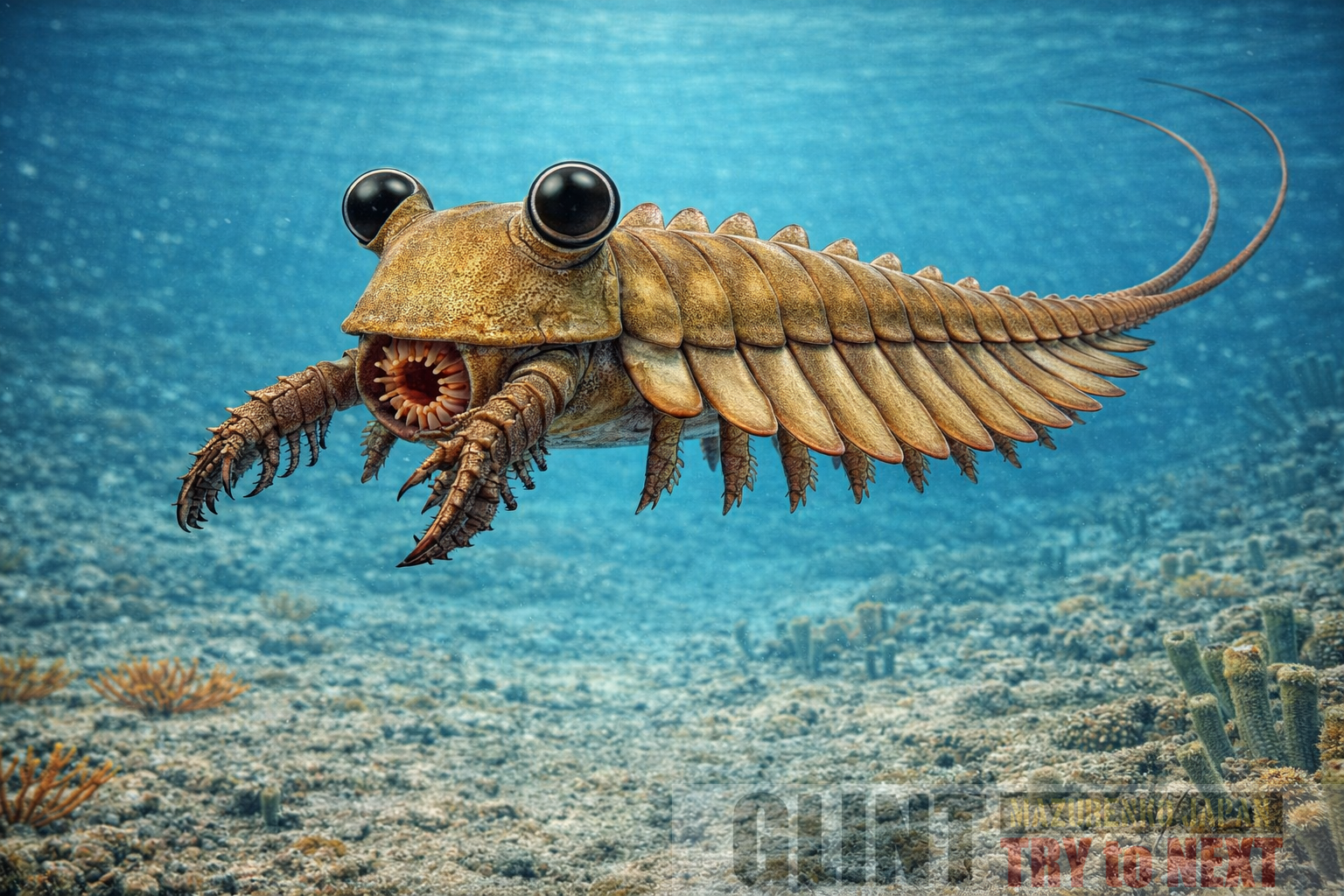 発達した前部付属肢で小型動物を捕捉する遊泳性捕食者で、側葉を波打たせて水中を移動していたと考えられます。保存状態の良い化石から三つの眼を持つことが判明し、高度な視覚に依存していた可能性があります。