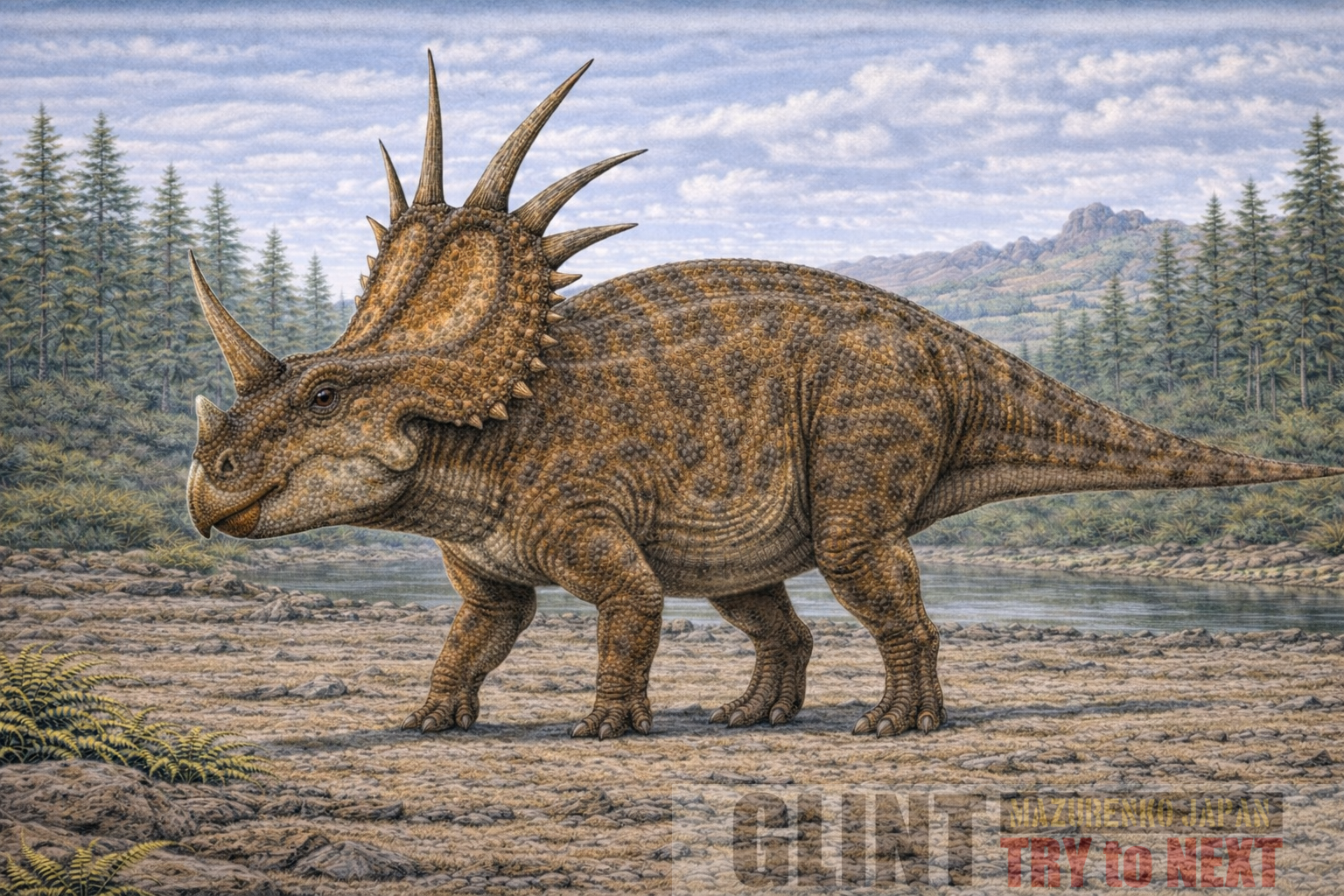 低木植物や被子植物を主食とする草食性恐竜で、大規模な群れを形成していた可能性が高いと考えられています。派手な角構造は捕食者への威嚇だけでなく、繁殖期のディスプレイや種内競争にも利用されていたと推定されています。