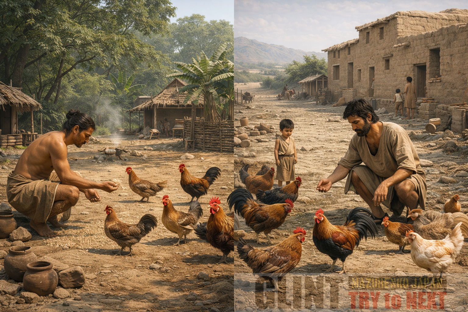 ニワトリの家禽化は約八千年前に東南アジアから中国南部にかけて始まったと考えられています。初期段階では食肉や卵の生産よりも闘鶏や祭祀といった行動特性の利用が中心でした。