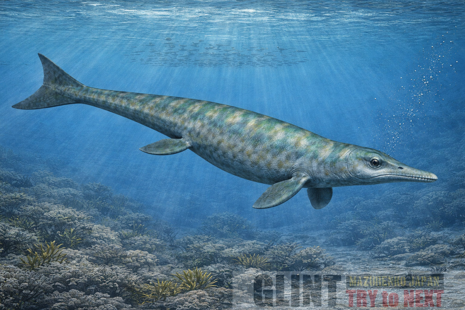 全長は約3〜4m前後と推定される中型海生爬虫類で、細長い体型と比較的小型の頭部を備えていました。尾鰭はまだ完全な三日月型には進化しておらず、背ビレも未発達でした。四肢はヒレ状に変化しつつある段階で、水陸両用的な特徴を残していました。