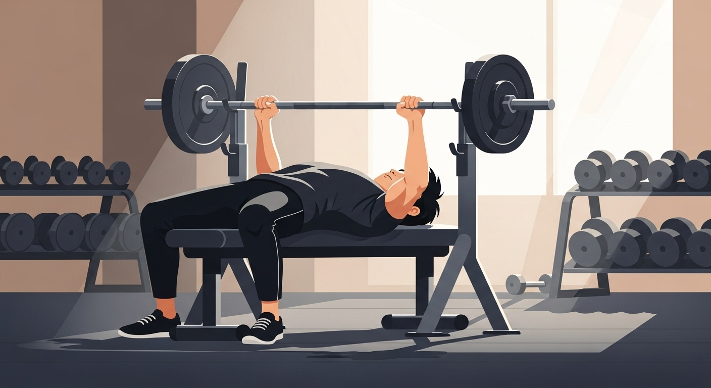 ベンチプレスで3-1-2法を実践する場合、まず重量を普段の70〜75%程度に落としてください。バーを胸に向けて3秒かけてゆっくり下ろし、胸の位置で1秒静止します。